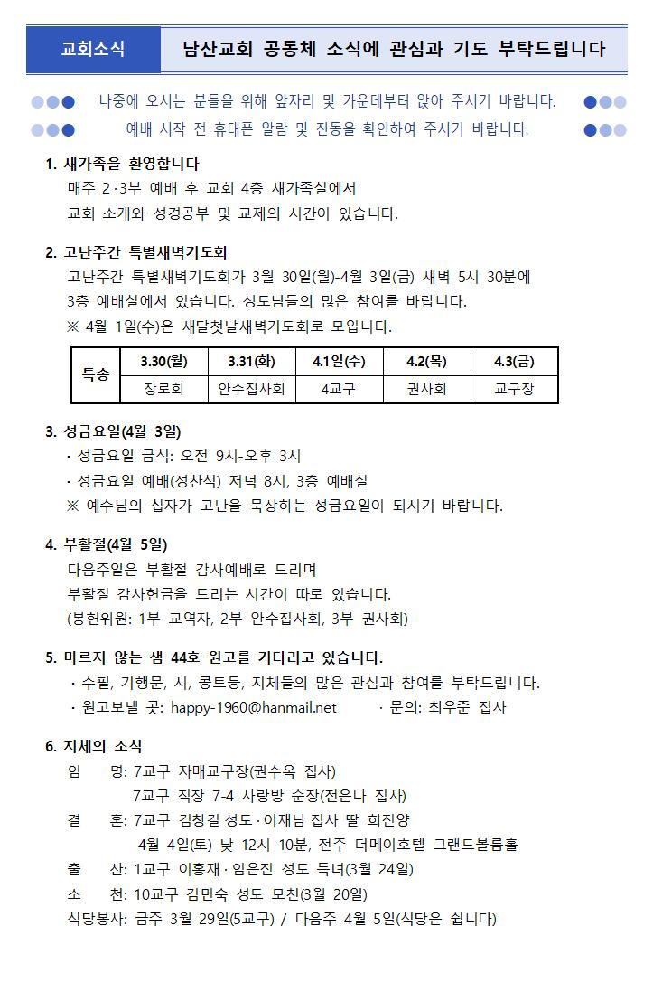 3월 29일 주보 페이지 정보 작성자한영순 댓글 0건 조회Hit 142회 작성일Date 26-03-31 17:05 본문 벚꽃이 활짝 피었습니다. 목록 이전글4월 5일 주보 26.04.11 다음글3월 22일 주보 26.03.20