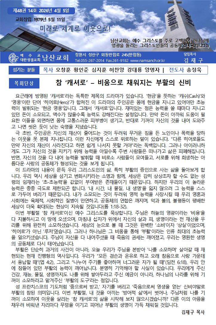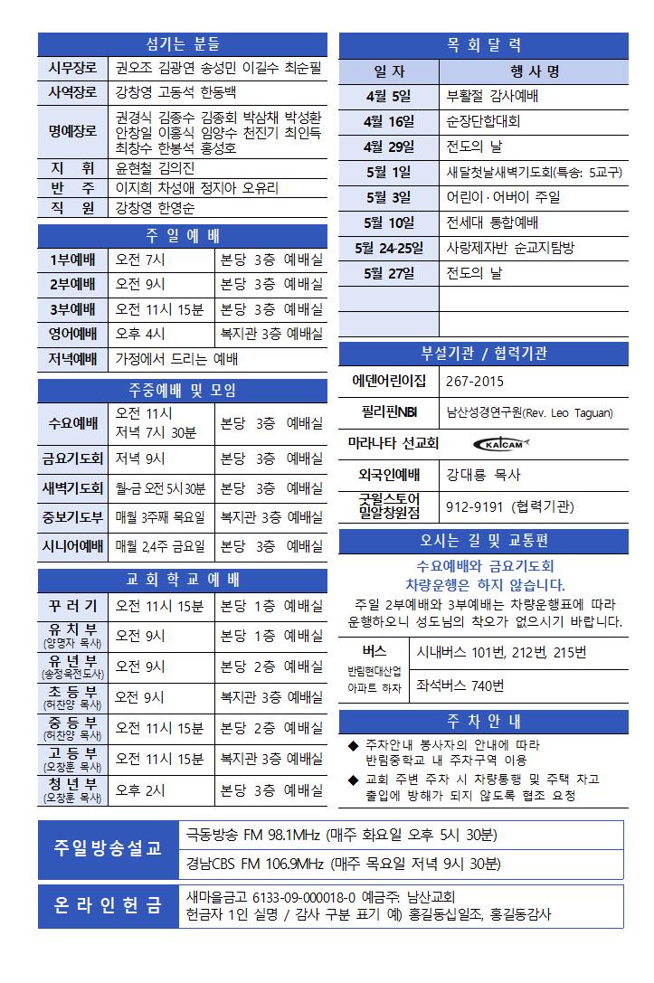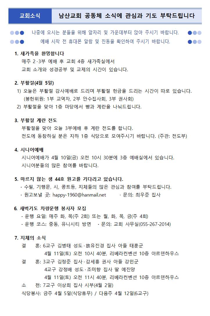 4월 5일 주보 페이지 정보 작성자한영순 댓글 0건 조회Hit 46회 작성일Date 26-04-11 13:16 본문 ?? 목록 이전글4월 12일 주보 26.04.11 다음글3월 29일 주보 26.03.31