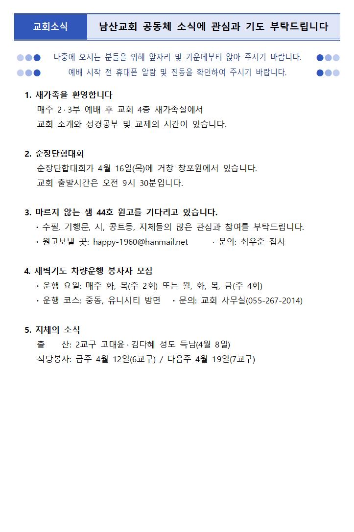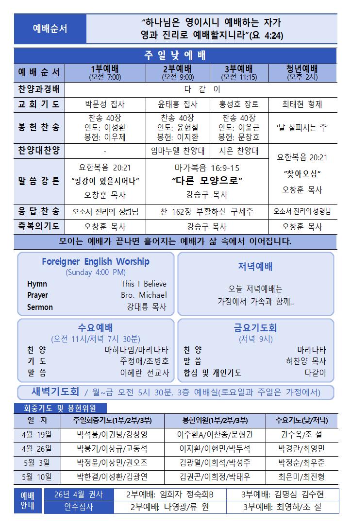 4월 12일 주보 페이지 정보 작성자한영순 댓글 0건 조회Hit 79회 작성일Date 26-04-11 13:20 본문 !! 목록 이전글4월 19일 주보 26.04.17 다음글4월 5일 주보 26.04.11