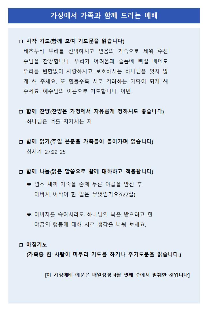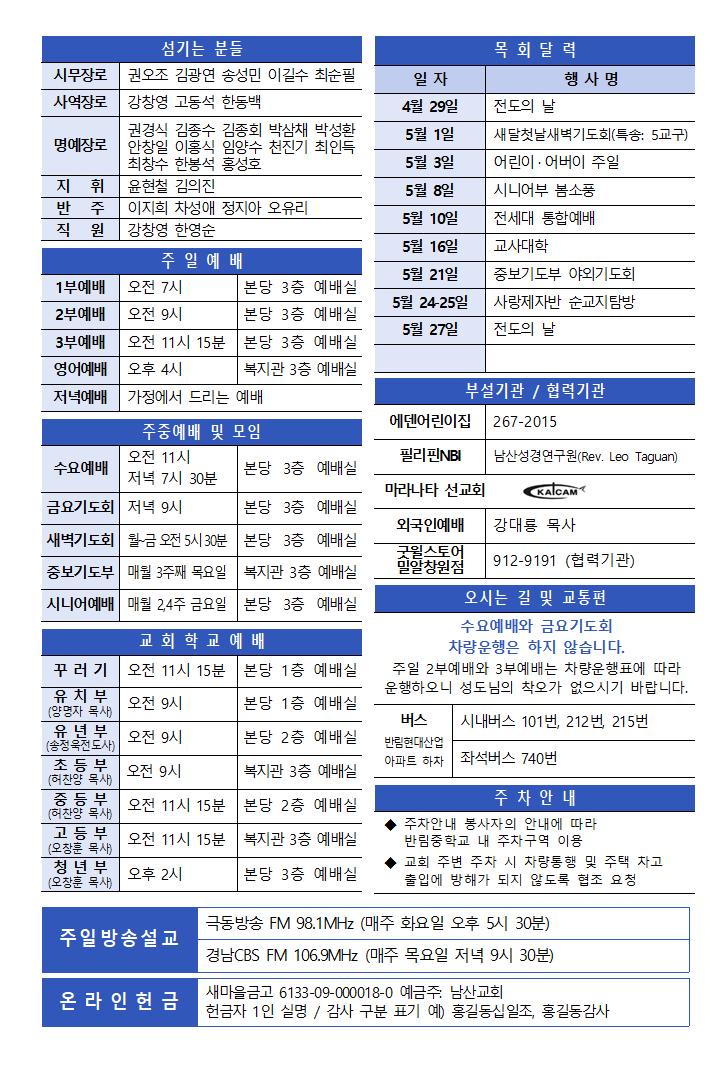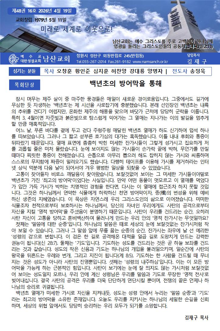 4월 19일 주보 페이지 정보 작성자한영순 댓글 0건 조회Hit 12회 작성일Date 26-04-17 17:25 본문 봄을 재촉하는 비가 내리는 오후 입니다. 목록 다음글4월 12일 주보 26.04.11