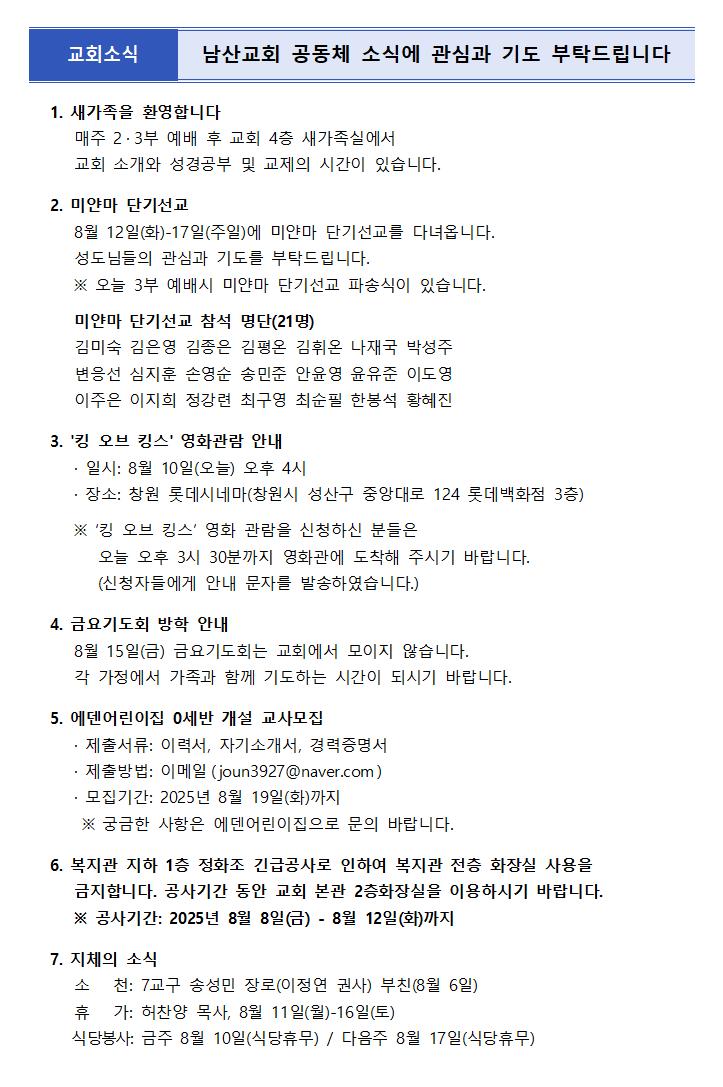8월 10일 주보 페이지 정보 작성자한영순 댓글 0건 조회Hit 422회 작성일Date 25-08-09 13:00 본문 아니벌써~~~~ 목록 이전글8월 17일 주보 25.08.28 다음글8월 3일 주보 25.08.09