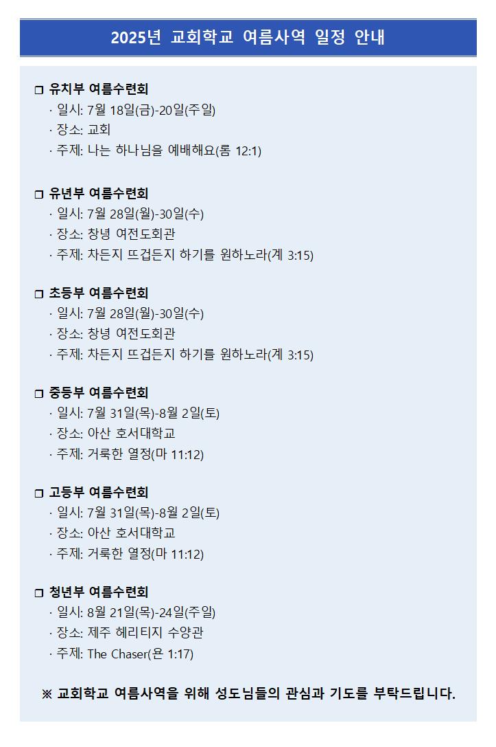 6월 29일 주보 페이지 정보 작성자한영순 댓글 0건 조회Hit 346회 작성일Date 25-06-27 16:28 본문 6월 29일 다섯 번 째 주일입니다1년의 52주의 1/2 26주흘러간 시간에 못했던 일들(기도, 말씀묵상, 삶의 예배)을아직 남아 있는 26주 동안 주님의 이름으로 애쓰며나아가길 기도합니다. 목록 이전글7월 6일 주보 25.07.04 다음글6월 22일 주보 25.06.20
