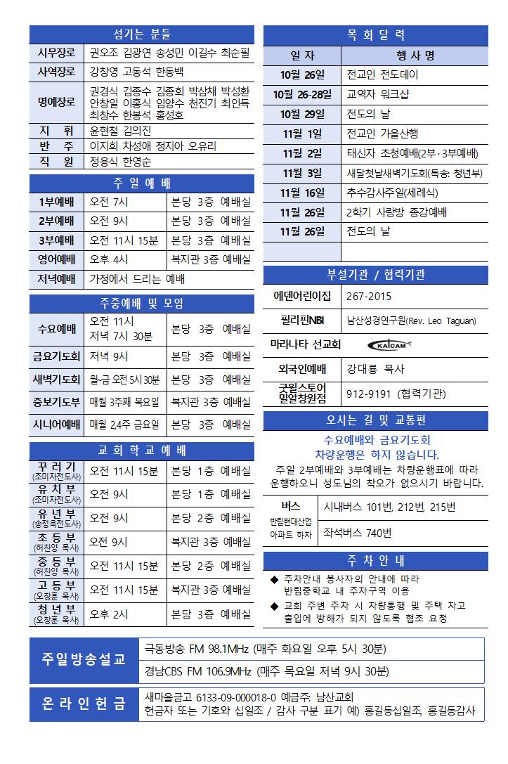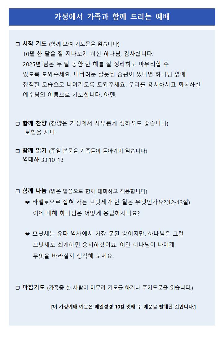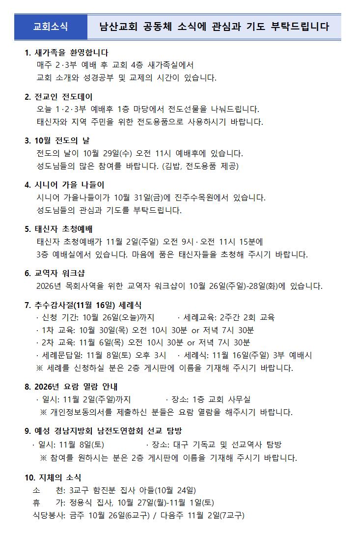 10월 26일 주보 페이지 정보 작성자한영순 댓글 0건 조회Hit 428회 작성일Date 25-10-24 16:19 본문 가을이 그냥스쳐 지나가 듯 가버리고 겨울이 온 것 같습니다.이런 환절기에 감기 조심하세요~~~~~~ 목록 이전글11월 2일 주보 25.11.08 다음글10월 19일 주보 25.10.24