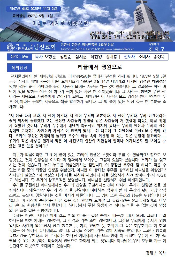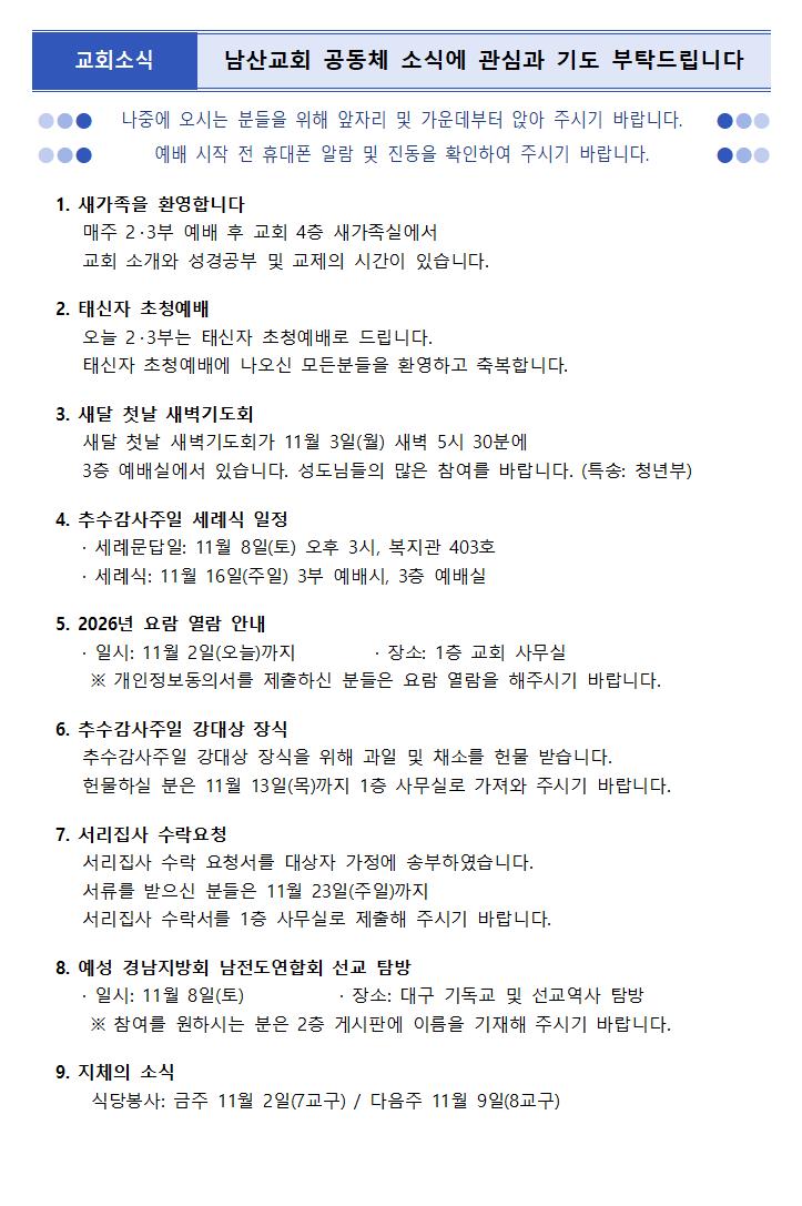 11월 2일 주보 페이지 정보 작성자한영순 댓글 0건 조회Hit 221회 작성일Date 25-11-08 11:02 본문 ~~ 목록 이전글11월 9일 주보 25.11.08 다음글10월 26일 주보 25.10.24