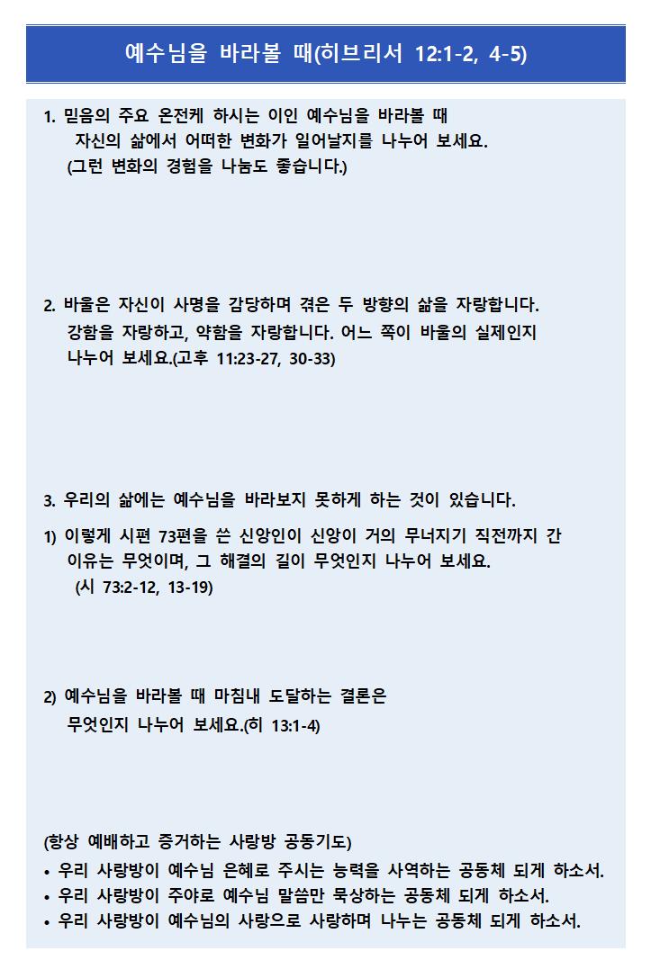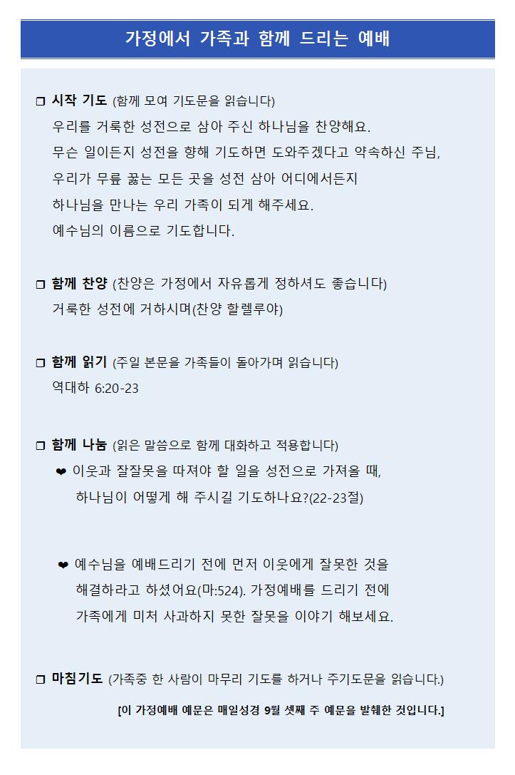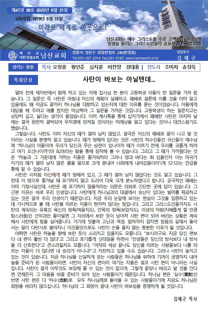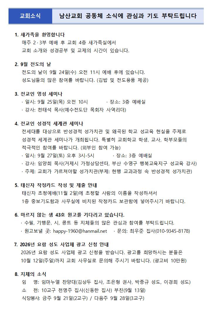 9월 21일 주보 페이지 정보 작성자한영순 댓글 0건 조회Hit 374회 작성일Date 25-09-19 15:11 본문 오늘 9월 19일 ~~~~선선한 날씨가 계속되면 좋겠습니다. 목록 이전글9월 28일 주보 25.09.27 다음글9월 14일 주보 25.09.19