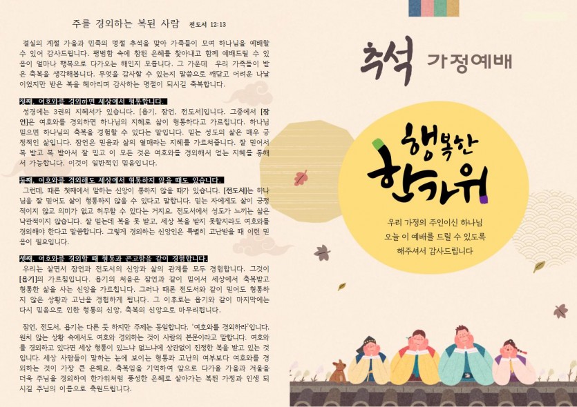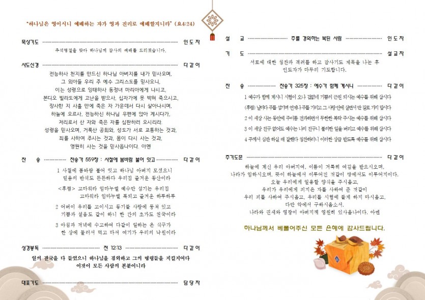 2025년 추석 명절 예배 순서지 페이지 정보 작성자한영순 댓글 0건 조회Hit 363회 작성일Date 25-09-27 11:07 본문 추석이 다가옵니다.가족과 함께 주님 안에서 행복하고 즐건 시간 되시길..... 목록 이전글10월 5일 주보 25.10.02 다음글9월 28일 주보 25.09.27