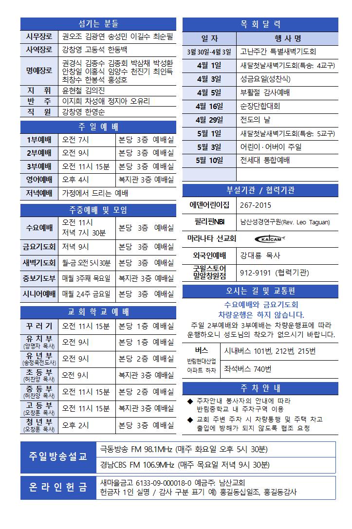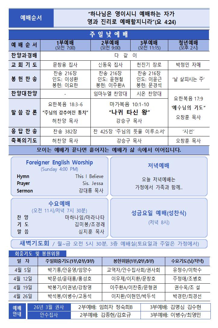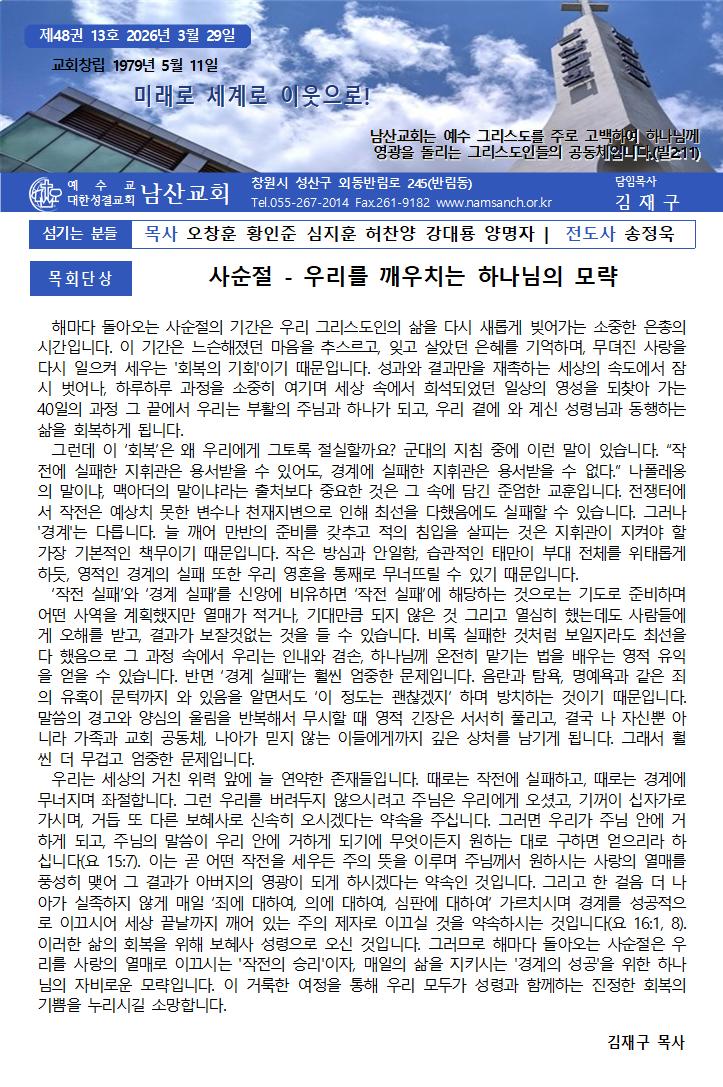 3월 29일 주보 페이지 정보 작성자한영순 댓글 0건 조회Hit 17회 작성일Date 26-03-31 17:05 본문 벚꽃이 활짝 피었습니다. 목록 다음글3월 22일 주보 26.03.20