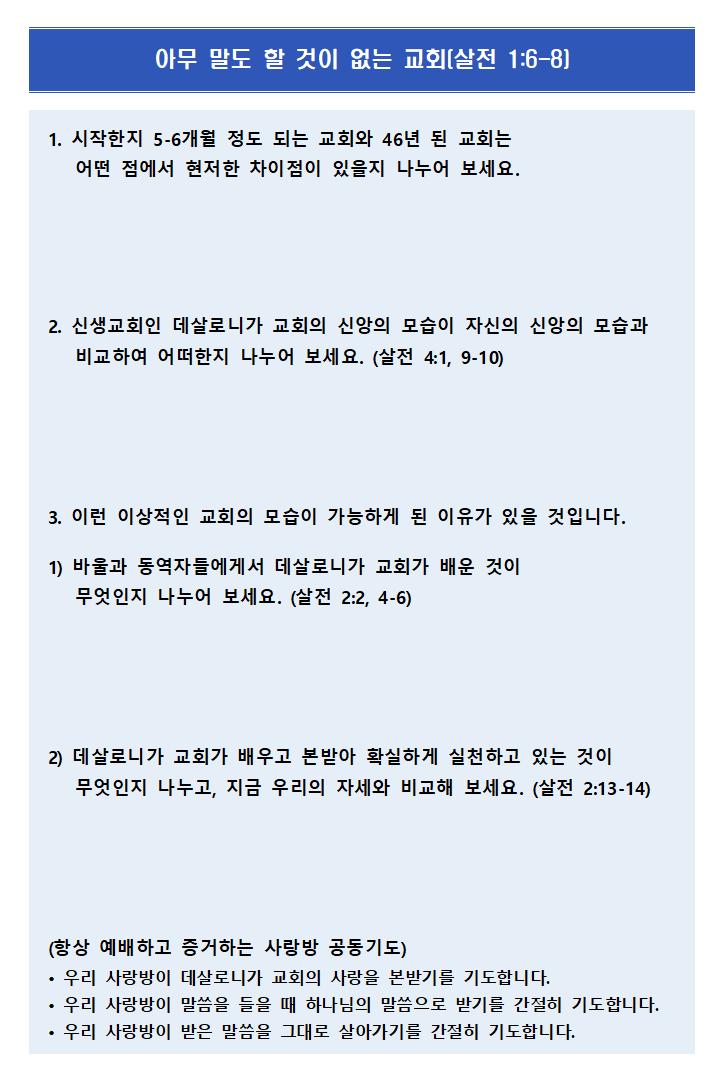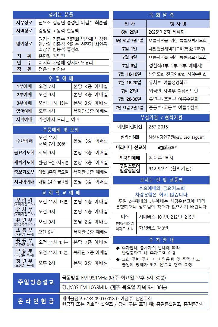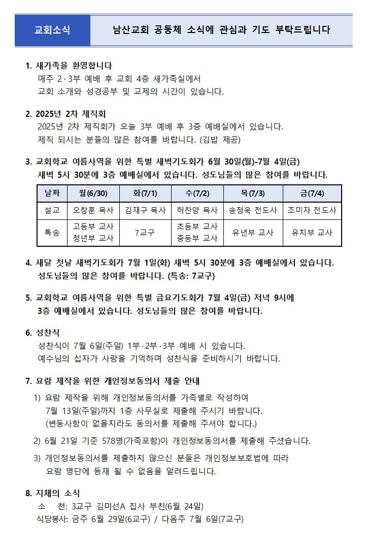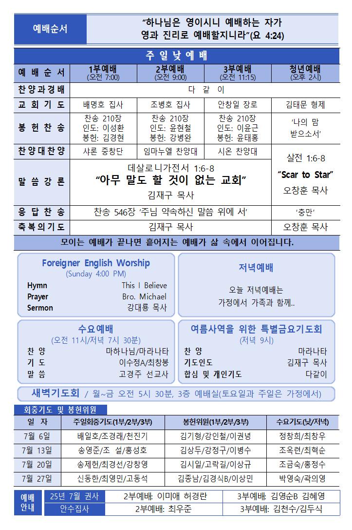 6월 29일 주보 페이지 정보 작성자한영순 댓글 0건 조회Hit 387회 작성일Date 25-06-27 16:28 본문 6월 29일 다섯 번 째 주일입니다1년의 52주의 1/2 26주흘러간 시간에 못했던 일들(기도, 말씀묵상, 삶의 예배)을아직 남아 있는 26주 동안 주님의 이름으로 애쓰며나아가길 기도합니다. 목록 이전글7월 6일 주보 25.07.04 다음글6월 22일 주보 25.06.20