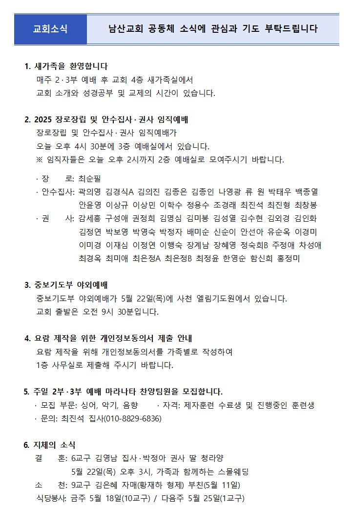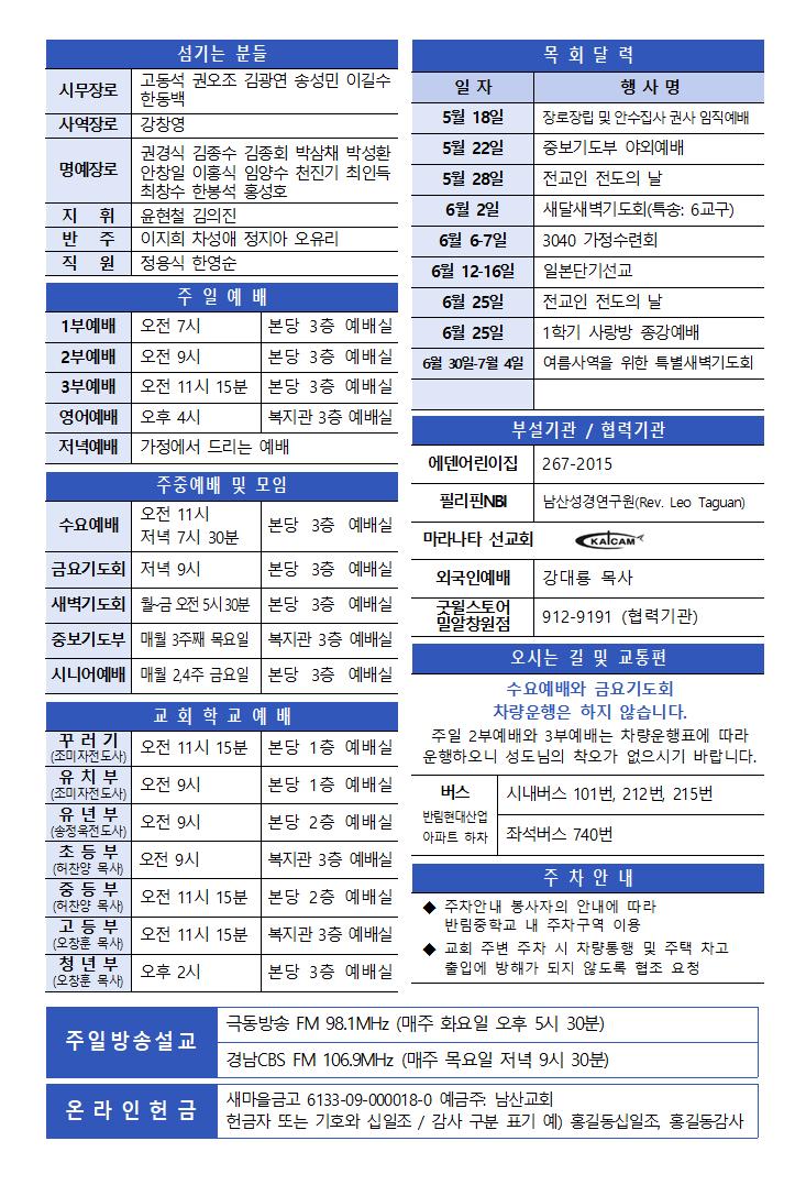 5월 18일 주보 페이지 정보 작성자한영순 댓글 0건 조회Hit 305회 작성일Date 25-06-11 16:46 본문 !!! 목록 이전글5월 25일 주보 25.06.11 다음글5월 11일 주보 25.05.09