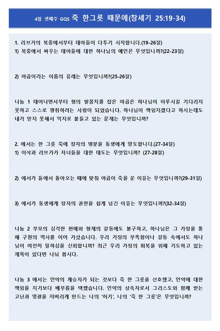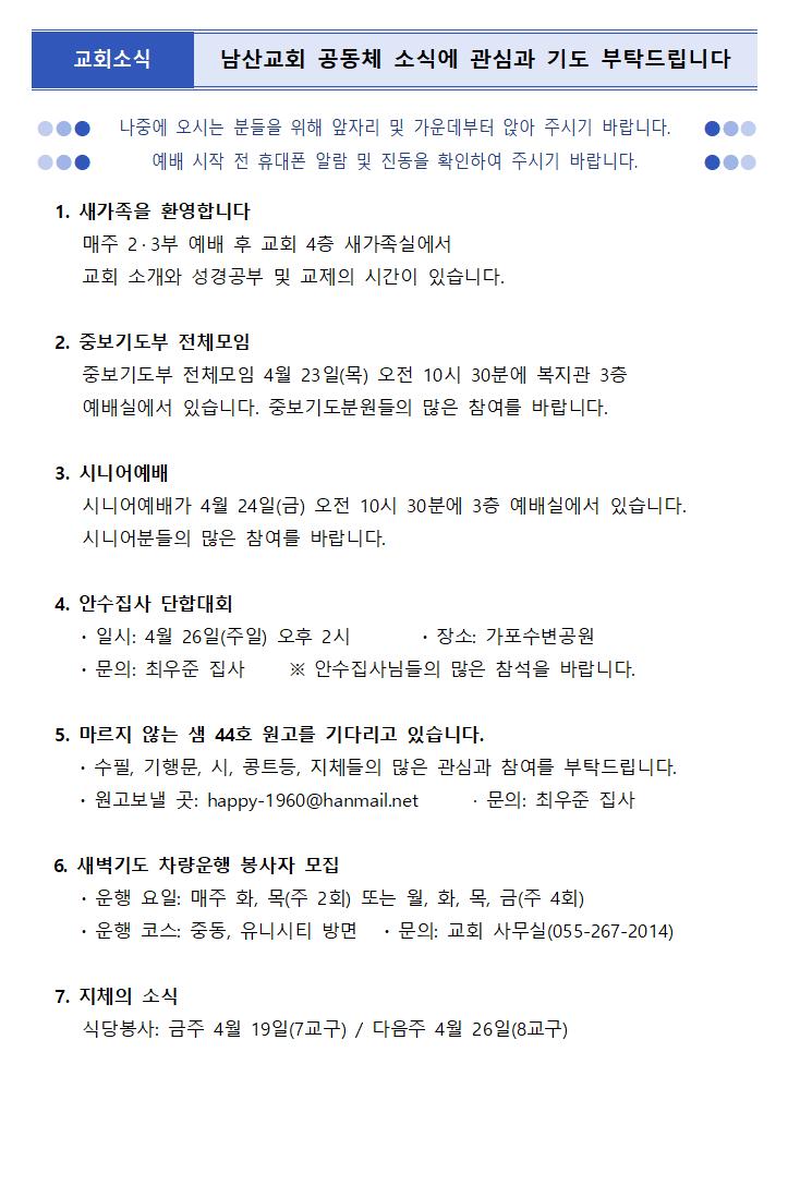 4월 19일 주보 페이지 정보 작성자한영순 댓글 0건 조회Hit 2회 작성일Date 26-04-17 17:25 본문 봄을 재촉하는 비가 내리는 오후 입니다. 목록 다음글4월 12일 주보 26.04.11